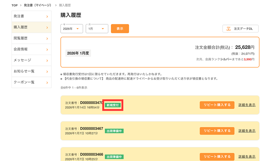 購入履歴画面を表示し、直前で購入した注文が「新規受付」になっていることを確認する。