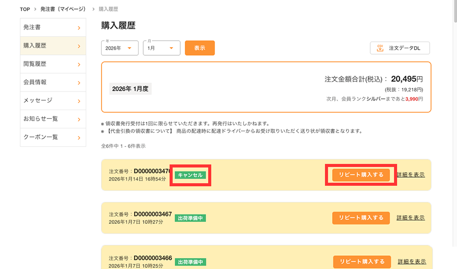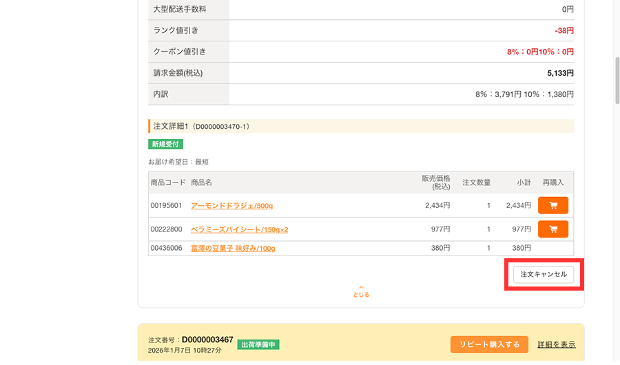 ステータスが「新規受付」から「キャンセル」になったことを確認し、「リピート購入」ボタンを押す。